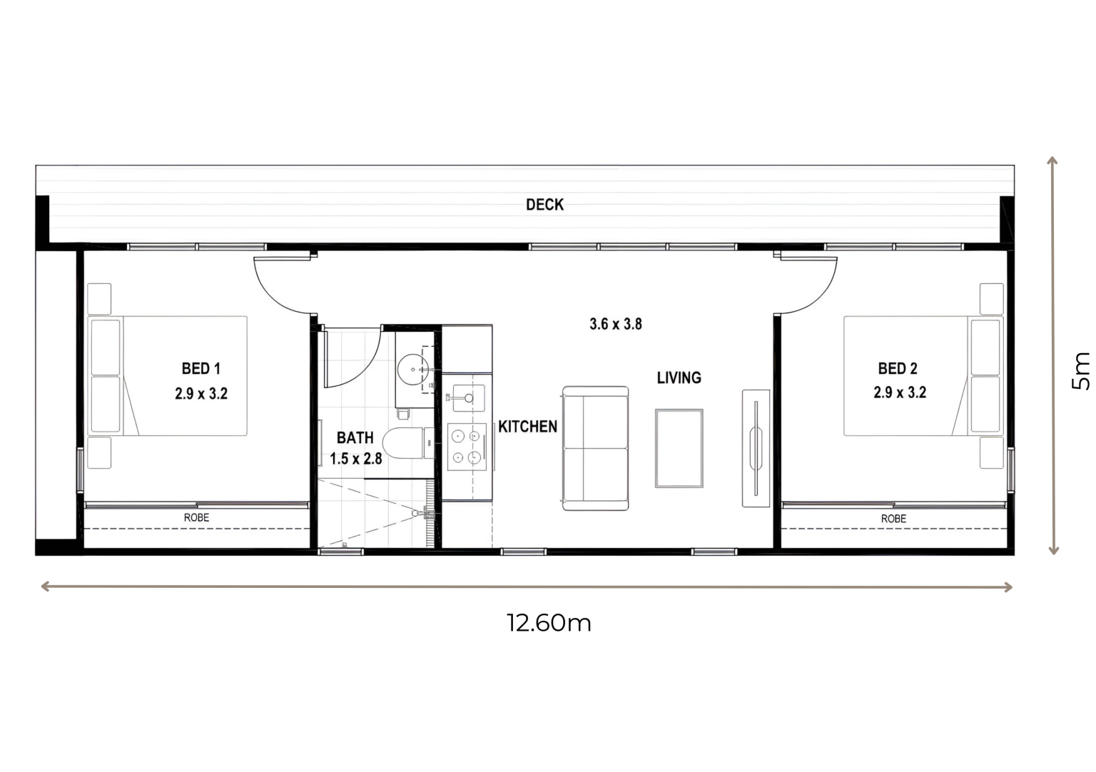 The Beaufort opens into a light-filled living area that connects seamlessly with the kitchen and leads onto a generous deck, extending the living space outdoors. Bedrooms are positioned at either end for privacy, each with built-in robes. The central bathroom is compact yet practical, featuring a full shower, vanity, and toilet.