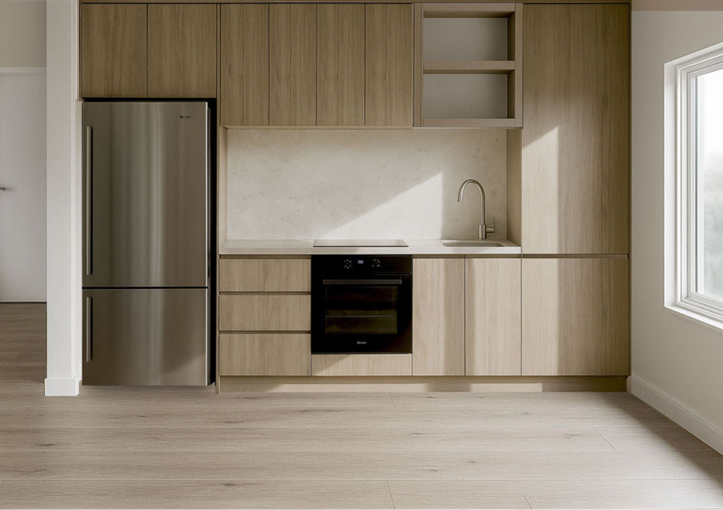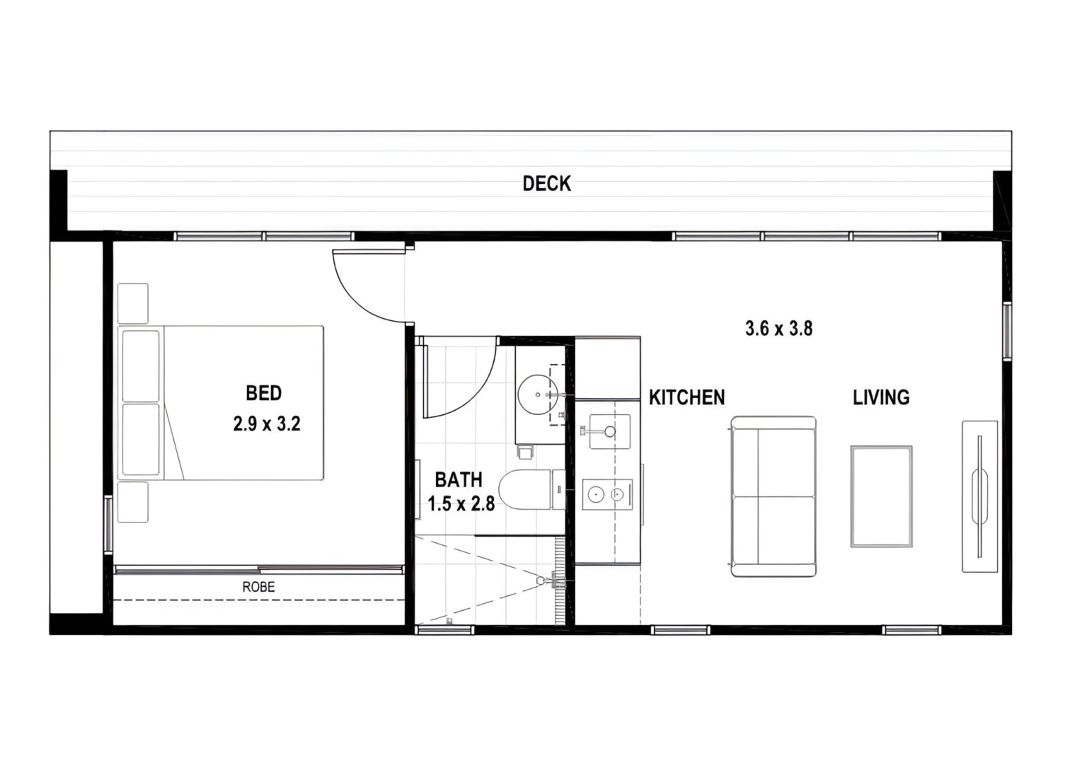 A compact one-bedroom design that delivers everything needed for comfortable, modern living. The open-plan kitchen and living area create a light, connected space that flows out to a generous deck. The bedroom includes a built-in robe, and the central bathroom is efficiently planned with quality fittings and finishes.